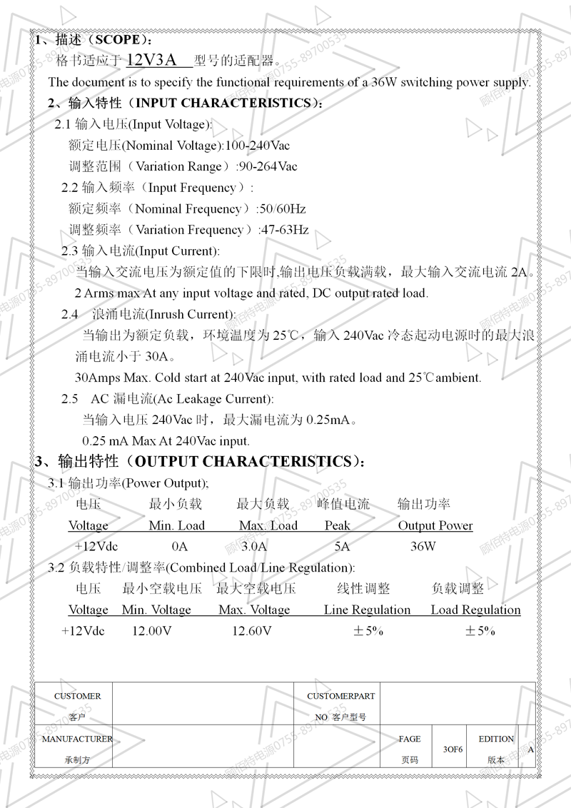 12V3A電源適配器規格書