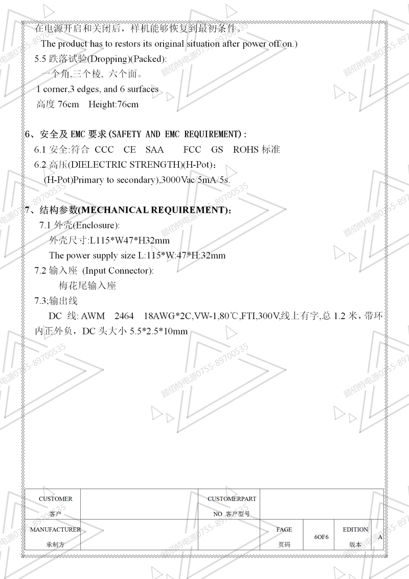 19V3.5A電源適配器規格書